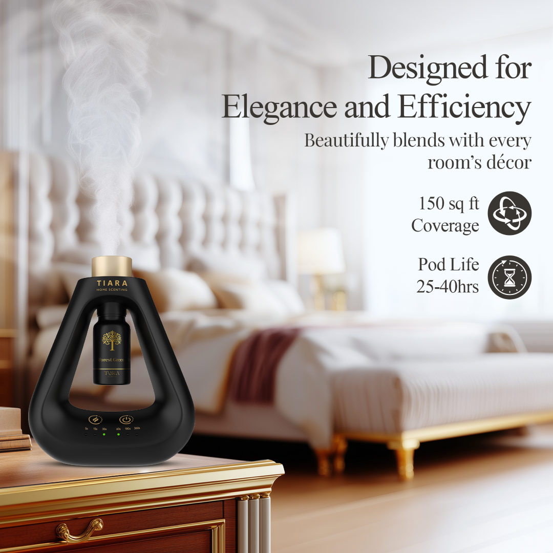 The Tiara Luxe Diffuser comes with a Forest Green fragrance pod to bring the outdoors inside. Using cold-air diffusion, it releases a fine, dry mist that keeps every note pure and long-lasting. Each pod delivers up to 100 hours of fragrance with no heat, no flames, and no water. With cordless convenience, 6 adjustable settings, and a smooth luxe white finish, it blends seamlessly into any room while filling it with fresh, effortless scent.